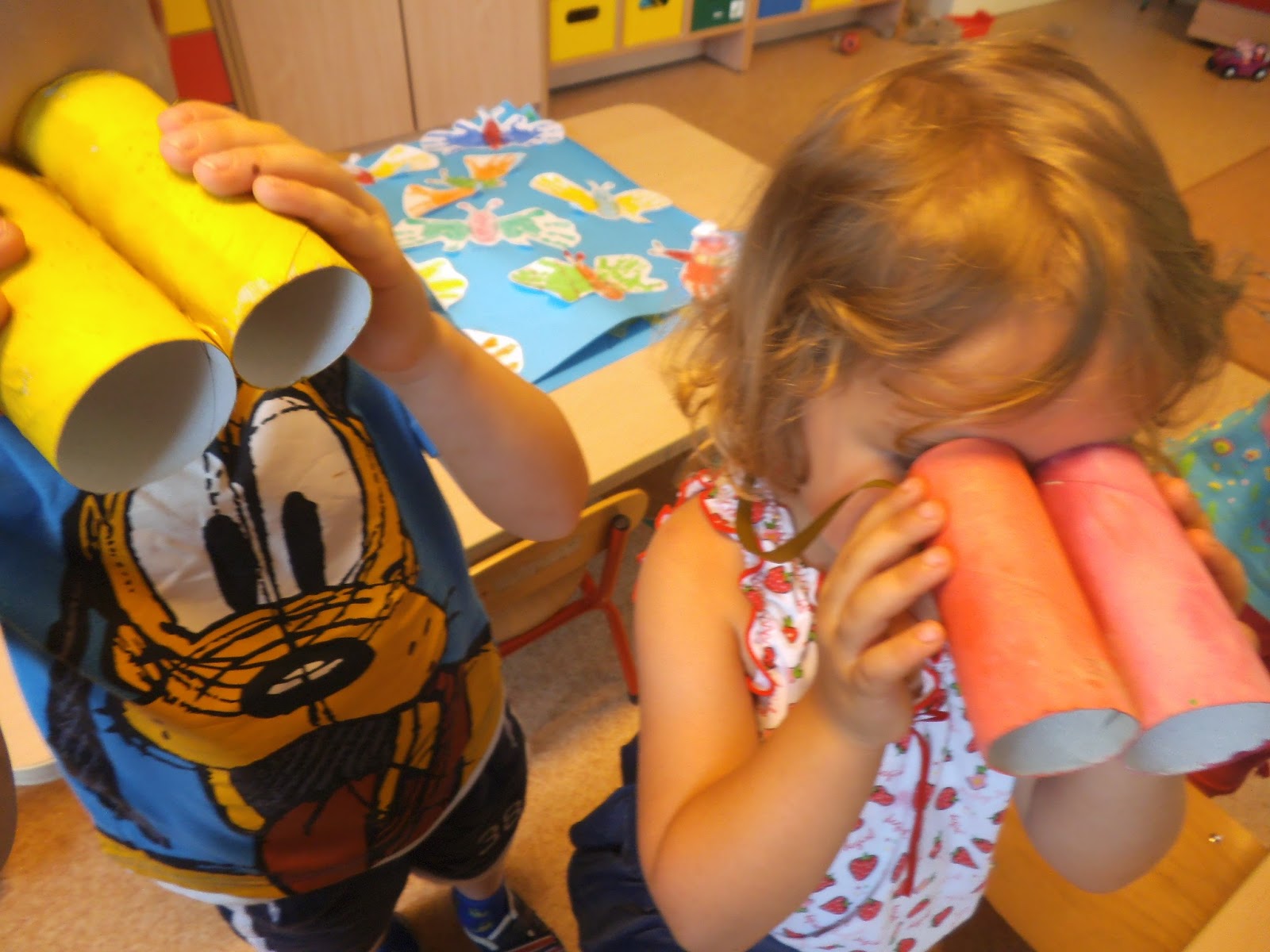 Dzieci od samego rana pracowały: najpierw pomalowały na ulubione kolory po 2 rolki papierowe, potem wybrały odpowiednie wstążki. Potem wszystkie elementy połączyliśmy za pomocą spinaczy i kleju. Ruszamy odkrywać!